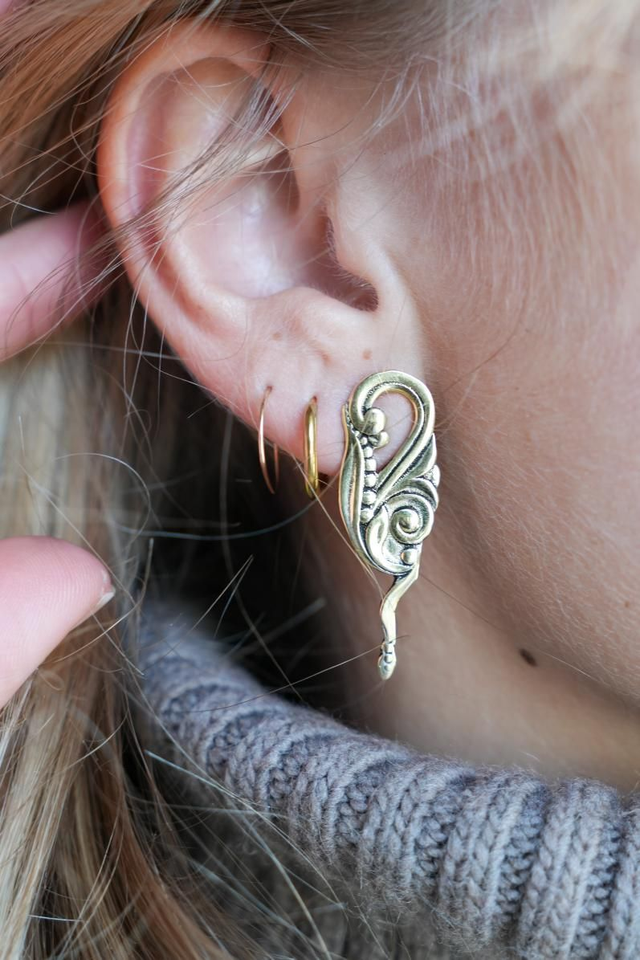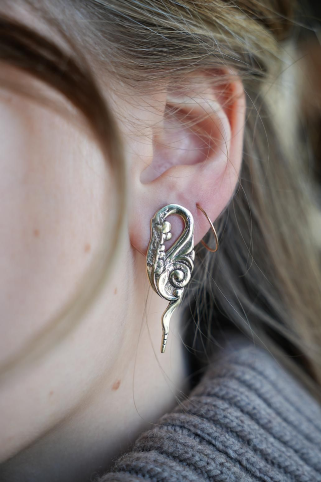 Des boucles d’oreilles délicates au motif courbé et organique, inspirées des formes végétales et des arabesques anciennes. Leur ligne fluide épouse naturellement le lobe et apporte une touche élégante et raffinée au visage.