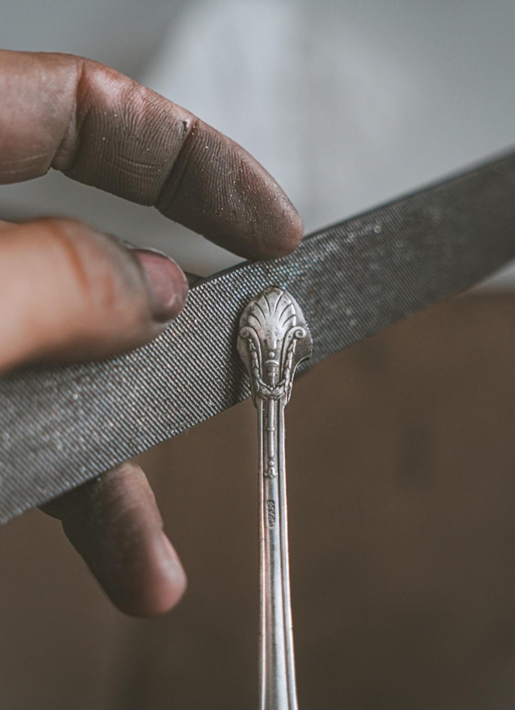 Depuis cet atelier improvisé, l’envie reste la même : transformer des couverts chinés, des objets oubliés, des traces du temps en bijoux uniques.